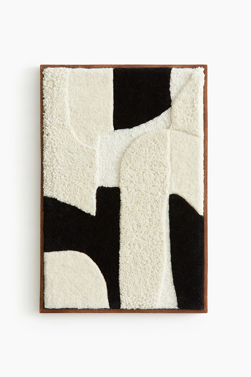Décoration murale qui associe des techniques de touffetage et de tissage pour créer un motif dynamique et des textures riches. Modèle avec cadre en bois pour un effet naturel. Clous de suspension non inclus.