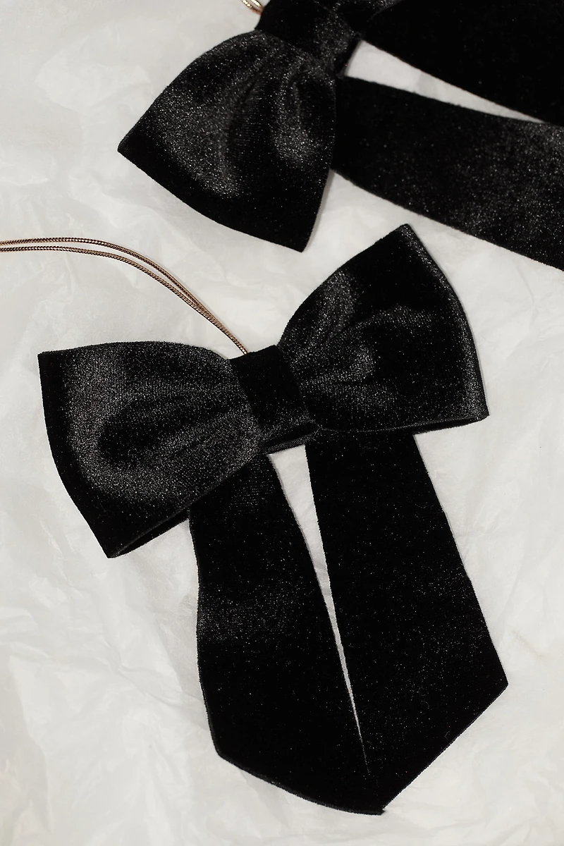Décoration en velours pour sapin de Noël. Modèle en forme de nœud avec cordon de suspension. Largeur 12 cm. Hauteur 14,5 cm.