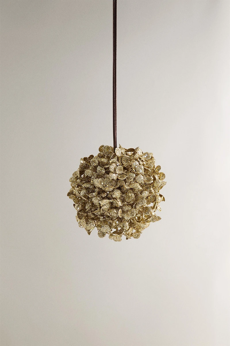 Décoration pour sapin de Noël en forme de sphère composée de nombreux pétales recouverts de paillettes.