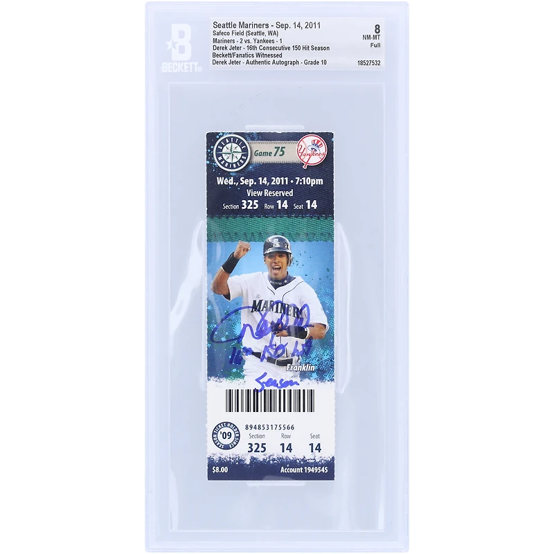 Derek Jeter, des Yankees de New York, a signé un billet authentifié 8/10 pour sa 16e saison consécutive de 150 coups sûrs, daté du 14 septembre 2011 et portant l'inscription « 16e saison de 150 coups sûrs ». Les fans de Beckett ont été témoins d'un billet authentifié 8/10 pour sa 16e saison consécutive de 150 coups sûrs, daté du 14 septembre 2011 et portant l'inscription « 16e saison de 150 coups sûrs ».