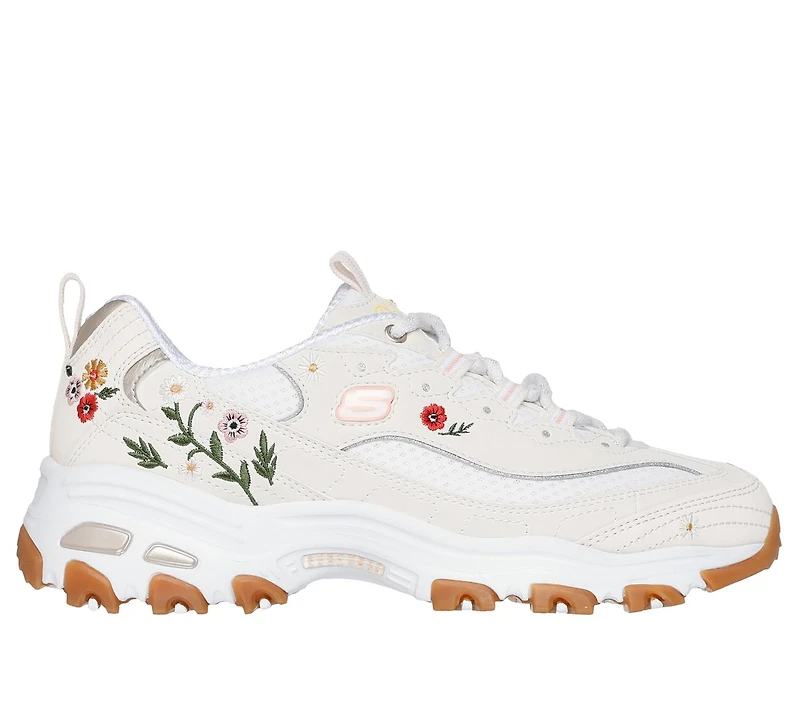 Adoptez un style emblématique avec une touche florale en portant la chaussure Skechers D'Lites® - Spring Bloom. Cette chaussure décontractée à lacets comprend une empeigne en cuir durable avec broderie florale, une semelle intérieure Skechers Air-Cooled Memory Foam® coussinée et une semelle intercalaire amortissante.