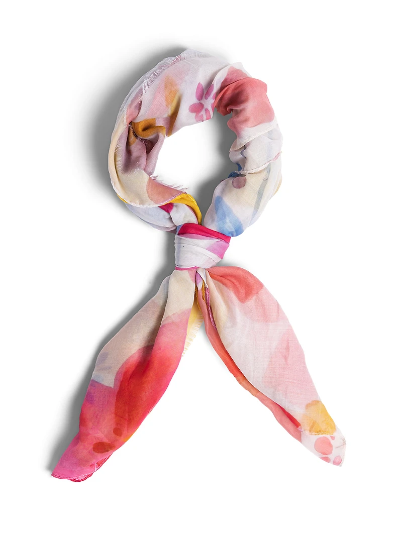 Écharpe légère en tissu tissé, forme rectangulaire. Imprimé multicolore sur fond clair, pour une touche élégante et lumineuse.