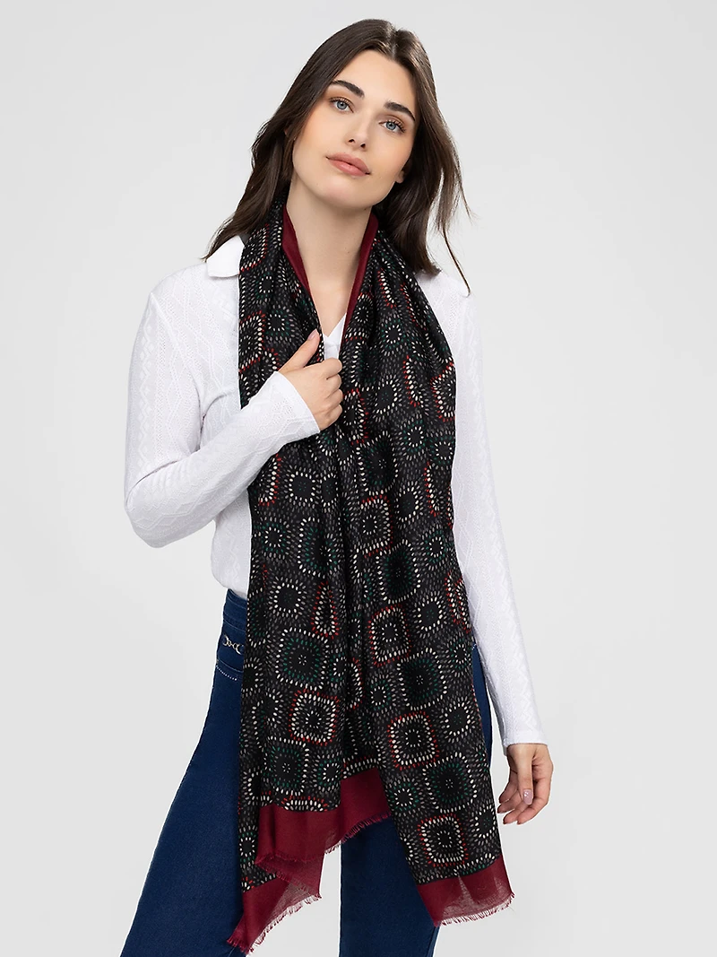 Foulard rectangulaire en textile tissé fin, présentant un motif géométrique répété multicolore sur fond sombre. Les extrémités sont terminées par de fines franges et une bordure contrastante unie.