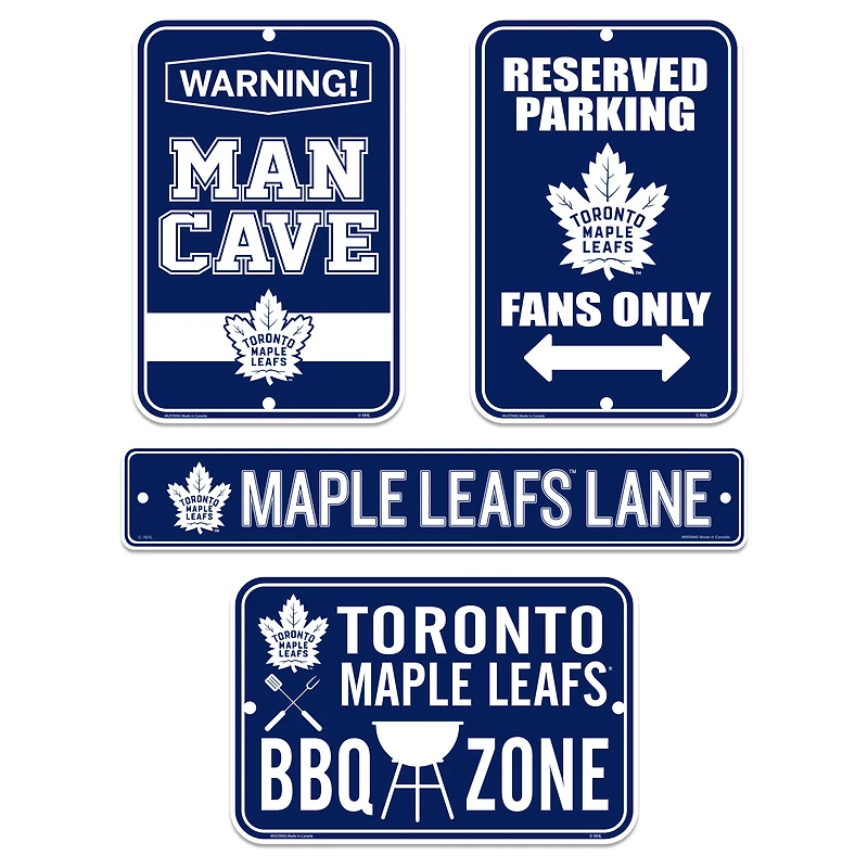 Ajoutez à votre vie l'esprit des Maple Leafs de Toronto dont vous avez tant besoin avec cet ensemble d'enseignes de fan de 4 pièces. Cet ensemble comprend quatre panneaux de rue différents, chacun avec des graphiques nets et des phrases amusantes des Maple Leafs de Toronto. Où que vous choisissiez d'accrocher ces adorables pancartes, votre fierté inébranlable des Maple Leafs de Toronto sera pleinement exposée!