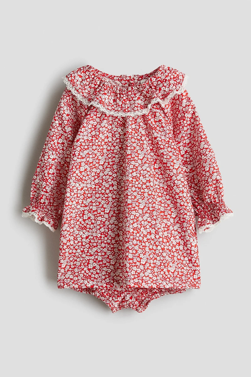 Les Adorables de H&M. Ensemble à motif fleuri, composé d'une robe trapèze et d'une culotte bouffante réalisées en douce popeline de coton de haute qualité. Robe à col volanté bordé de dentelle délicate et longues manches plissées, terminées en nid d'abeille et bord volanté en dentelle. Ouverture boutonnée au dos. Culotte bouffante sur élastique souple et habillé à la taille et autour des jambes. La collection Les Adorables de H&M regroupe une sélection d'articles de qualité très confortables au charme intemporel.