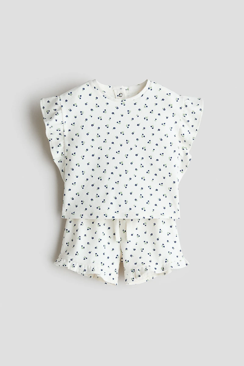 Ensemble à motif en jersey de coton doux, composé d'un haut et d'un short. Haut à encolure ronde, emmanchures tombantes et manches volantées. Ouverture à pression au dos. Short à bord volanté en haut, élastique réglable à la taille et cordon de serrage décoratif devant. Bord volanté en bas de jambe.