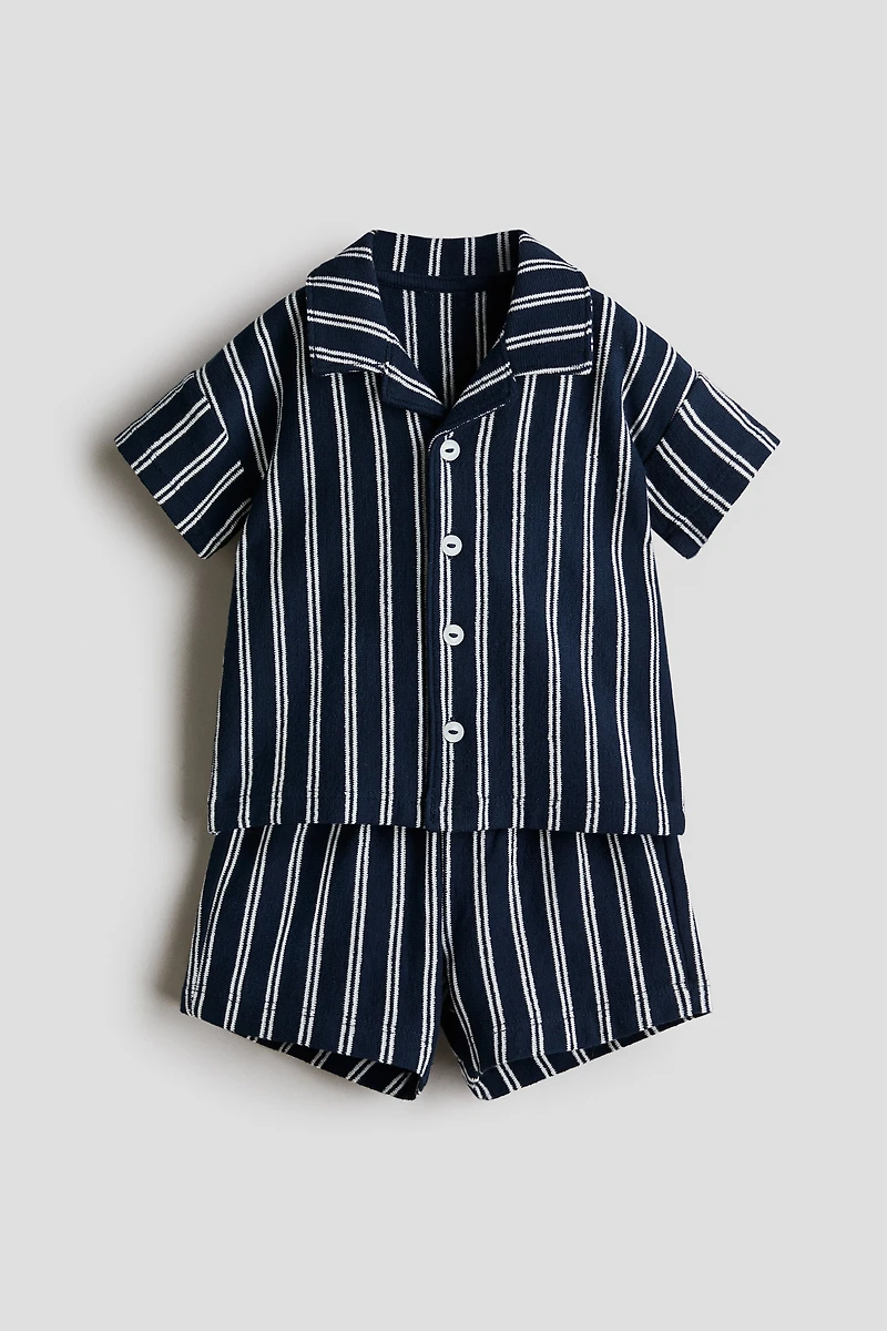 Ensemble en coton éponge doux et léger, composé d'une chemise et d'un short. Chemise à col cubain avec boutonnage devant. Emmanchures descendues et manches courtes. Short avec élastique et cordon de serrage à la taille.