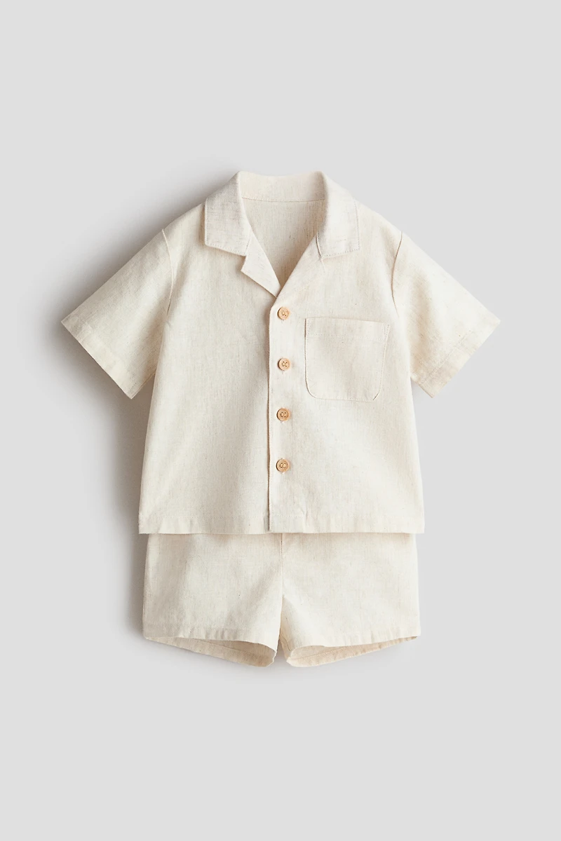 Ensemble en tissu de lin et coton mélangés, composé d'une chemise et d'un short. Chemise avec col cubain, poche de poitrine et boutons en imitation bois devant. Emmanchures descendues et manches courtes. Short avec élastique réglable à la taille et revers cousu en bas de jambe.