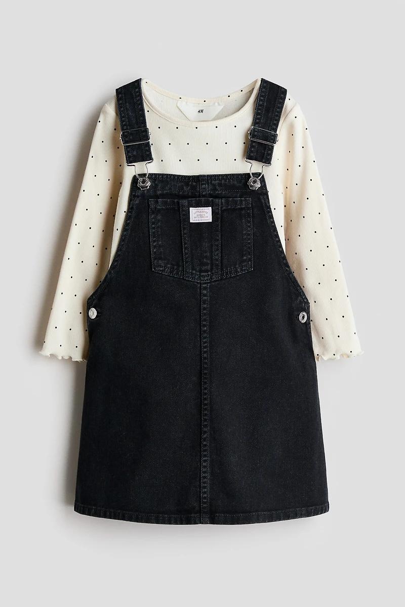 Ensemble en coton, composé d'un haut en jersey doux et côtelé et d'une robe salopette en denim. Haut à encolure ronde et manches longues. Bord surjeté aux poignets et au bas. Robe salopette à bretelles réglables munies d'attaches en métal et de boutons-pression sur les côtés. Poche de poitrine et poches derrière.