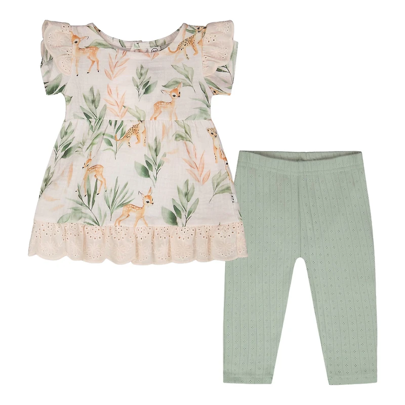 L’ensemble tunique en mousseline et legging en pointelle pêche à imprimé cerfs et vert apporte un souffle printanier plein de douceur. Une tunique légère à manches courtes à volants, à taille froncée et à ourlet à volants s’associe à un legging en pointelle vert tendre. La tunique est confectionnée en mousseline enrichie d’élasthanne pour un maximum de confort, tandis que le legging est en coton pur pour la respirabilité. Idéal pour les promenades ensoleillées ou les moments de jeu, cet ensemble allie poésie et confort. Parfait à associer avec d’autres pièces de notre collection "Douce savane" pour un look harmonieux de saison.Caractéristiques: