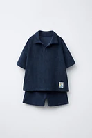 Ensemble deux pièces. Polo avec col polo et manches courtes. Application d'une étiquette en bas. Bermuda avec taille élastique. Tissu éponge.