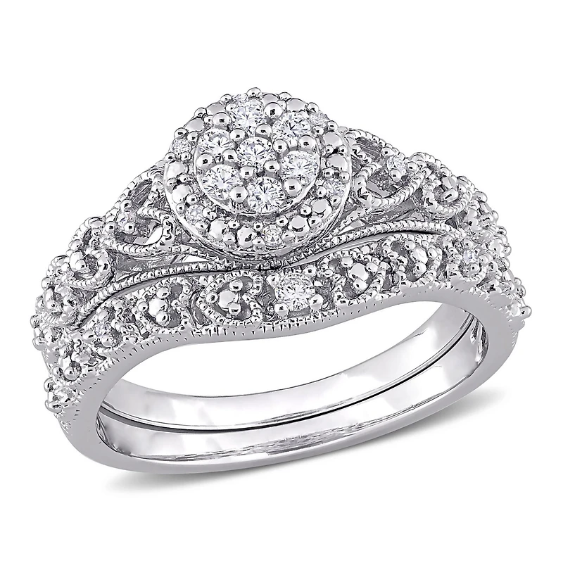 Faites preuve de votre dévouement en offrant cet ensemble nuptial à auréole de diamant Miabella. Façonnées en argent sterling reluisant, cette bague de fiançailles et la bague d’alliance assortie mettent en valeur 18 diamants (H-I, I3) de coupe ronde, sertis pavé et sur griffes, disposés en grappe au centre et scintillant le long des anneaux filigranes. Rehaussé d’une finition brillante, cet ensemble nuptial en diamant fera un cadeau exceptionnel qui comblera votre bien-aimée.Les bijoux Miabella: Un bijou parfait est un accessoire éblouissant et très particulier qui vous accompagnera toute une vie. Avec plus de 30 ans d'expérience en création de bijouterie fine, Miabella a tout ce dont vous recherchez pour souligner une occasion spéciale à l'aide d'un petit quelque chose qui étincelle. Miabella - l'harmonie dans la bijouterie. La vie est une symphonie, célébrez-la!