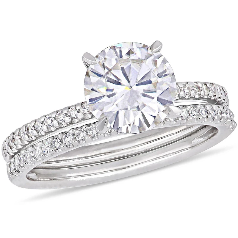 Cet ensemble nuptial en moissanite et diamant de Miabella va ajouter une touche de charme romantique à votre union. Fixé sur une monture en or blanc reluisant, cet ensemble nuptial élégant de bague met en valeur un moissanite de synthèse rond (8mm) en son centre ainsi que 47 diamants blancs glacés (G-H, I1-I2) de coupe ronde qui scintillent le long de l’anneau et la bague d’alliance assortie. Cet ensemble nuptial stupéfiant est rehaussé d’une finition brillante. Les bijoux Miabella: Un bijou parfait est un accessoire éblouissant et très particulier qui vous accompagnera toute une vie. Avec plus de 30 ans d'expérience en création de bijouterie fine, Miabella a tout ce dont vous recherchez pour souligner une occasion spéciale à l'aide d'un petit quelque chose qui étincelle. Miabella - l'harmonie dans la bijouterie. La vie est une symphonie, célébrez-la!