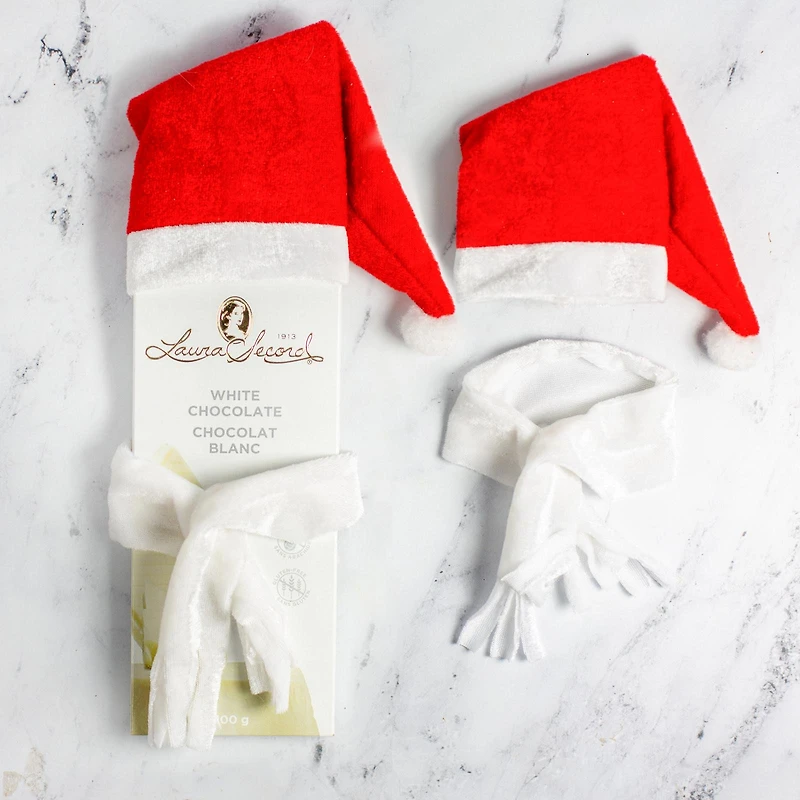 Charmant ensemble de tuque et foulard pour donner un petit air des Fêtes à votre barre 100 g - Barre de chocolat non comprise. 7g 11 x 1 x 41 cm 86636 Ingrédients: