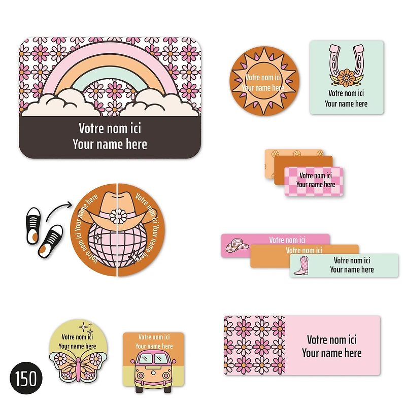 ÉDITION ESSENTIEL — 150 ÉTIQUETTES L’Édition Essentiel propose un équilibre parfait pour accompagner les enfants de la garderie à l’école. Elle contient 150 étiquettes autocollantes de plusieurs tailles, idéales pour marquer aussi bien de petits objets que de plus gros items. On y retrouve également 8 paires d’étiquettes spécialement conçues pour les souliers, facilitant l’autonomie des enfants dans leur routine matinale. Résistantes à l’eau, au froid, à la chaleur et à la vapeur, elles supportent le lave-vaisselle, la laveuse, la sécheuse, le micro-ondes, le congélateur et le réfrigérateur. Sans repassage requis. Il suffit de les appliquer sur une surface propre et sèche, puis de respecter un délai de 24 heures avant toute exposition à l’humidité. Chaque étiquette est personnalisée avec un nom et/ou numéro de téléphone imprimé en deux lignes de 16 caractères. Guide d’utilisation