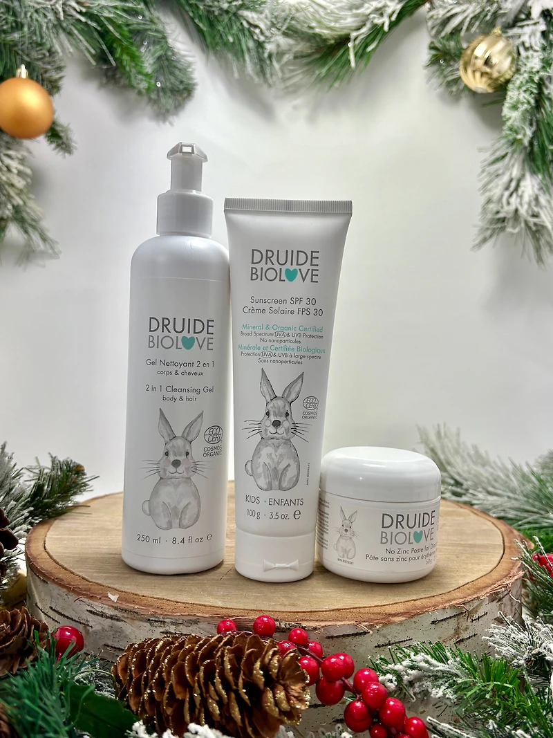 Protect your most precious skin with the Druid Gift Set #6. This organic protection duo combines Baby SPF 30 Sunscreen and Zinc-Free Diaper Rash Paste for complete, natural coverage. The mineral sunscreen provides effective protection without harsh chemical filters, while the paste soothes and prevents irritation and redness. Specifically formulated for the delicate skin of babies and children, these products are also suitable for adults with hypersensitive skin. An essential set to protect your loved ones while respecting their fragile skin with safe, natural ingredients.