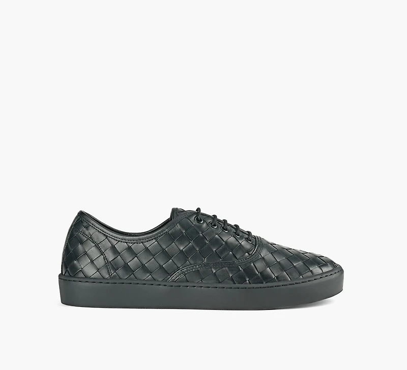 Envie de rehausser votre collection de baskets ? Le modèle Ferruccio de LUCA DEL FORTE répond présent. S’inspirant de la silhouette rétro de la plimsoll, cette paire se distingue par une tige en cuir tressé intrecciato, élégamment maintenue par un laçage épuré sur l’empeigne. Une semelle en caoutchouc épaisse vient ancrer le style, tandis que sa finition monochrome facilite les associations, quelle que soit l’occasion.