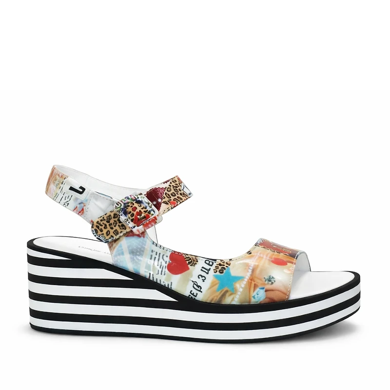 Sa large bride avant transparente met en valeur l’imprimé tout en apportant légèreté et modernité au modèle. La bride ajustable à la cheville assure un maintien confortable, tandis que la semelle compensée plateforme rayée noir et blanc ajoute une silhouette contemporaine et dynamique. À la fois confortable et audacieuse, FIGG est parfaite pour celles qui veulent ajouter du caractère à leurs tenues estivales.