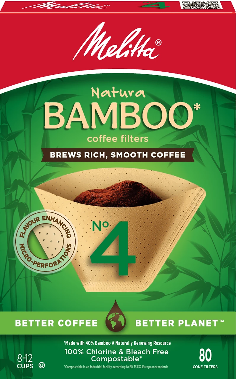 Les filtres à café coniques en bambou de Melitta permettent de préparer un café filtre respectueux de l’environnement. Matière première renouvelable, le bambou entièrement naturel n’altère pas la saveur du café. Les filtres à café coniques Melitta sont les seuls du genre à être pourvus d’un système breveté de microperforations permettant d’extraire les arômes du café et de le laisser s’épanouir pleinement en une infusion riche et savoureuse. Les filtres à café de qualité supérieure Melitta éliminent les impuretés pour mieux révéler la pleine saveur du café. Tous les filtres coniques Melitta ont une double couture très résistante, les garantissant contre toute rupture.