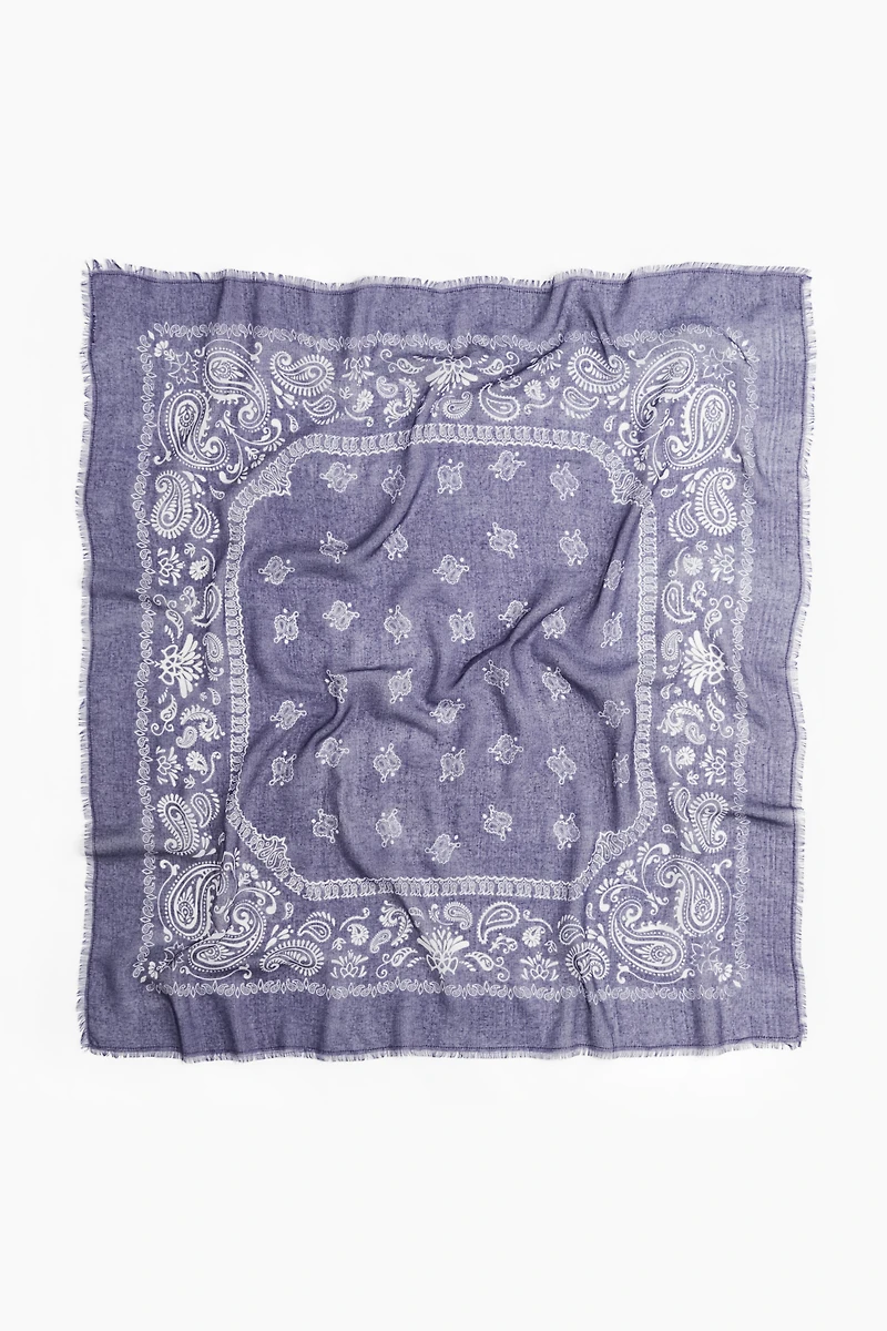 Grand foulard carré en tissu aérien avec décor imprimé et bords frangés.