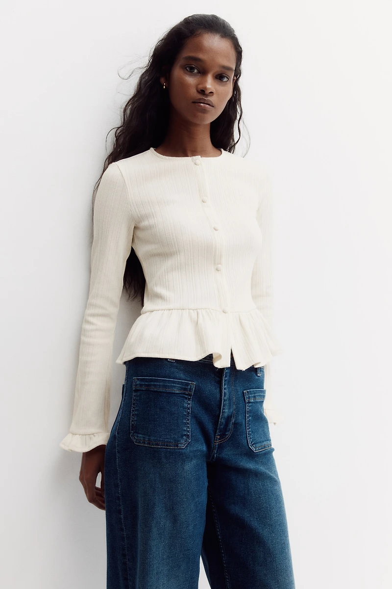Gilet en tricot finement côtelé. Modèle ajusté à encolure ronde et boutons habillés descendant jusqu'à la taille. Manches longues terminées par bord volanté. Couture froncée à la taille pour une basque évasée.
