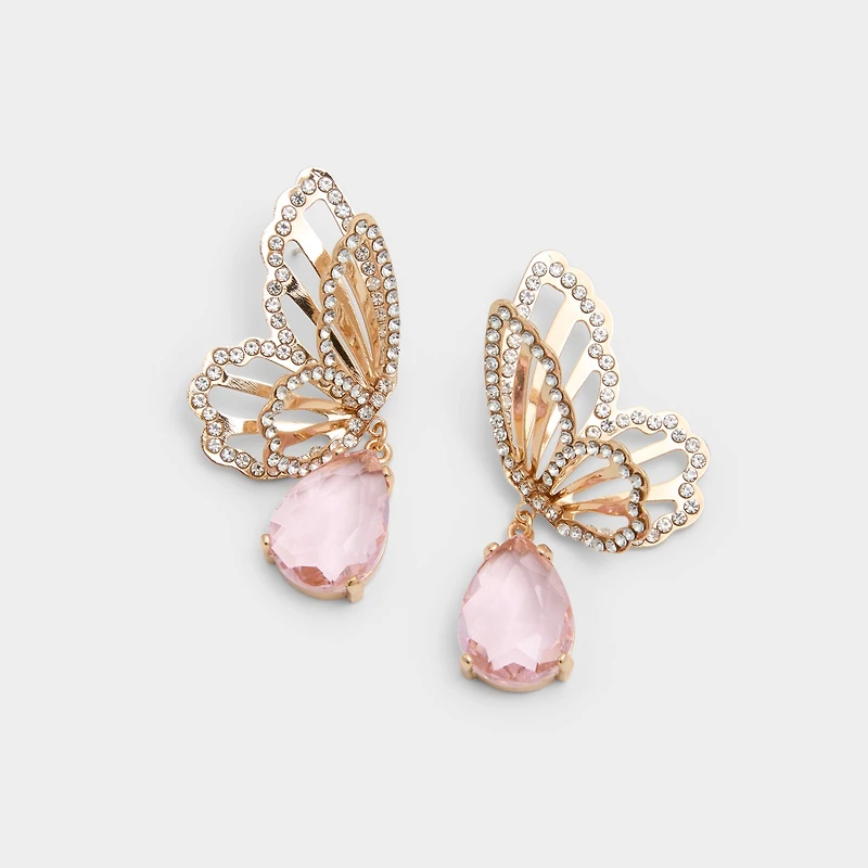Laissez-vous charmer par cette paire de boucles d’oreilles dorées en forme de papillon s’inspirant de Glinda et ornées de pierres roses sublimes.