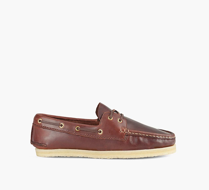 Interprétation contemporaine de la chaussure de pont classique, la Godney Boat de Clarks Originals s’inspire des modèles d’archives. Confectionnée en cuir riche, elle se distingue par une couture d’empeigne façon Wallabee, une construction mocassin et une semelle en crêpe souple à profil bas. Les lacets carrés en cuir et les œillets métalliques complètent son allure premium et patrimoniale.