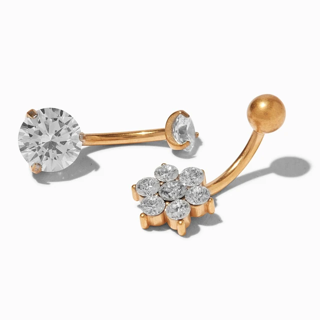 Gold-tone Titanium Cubic Zirconia Flower 14G Belly Bars - 2 Pack