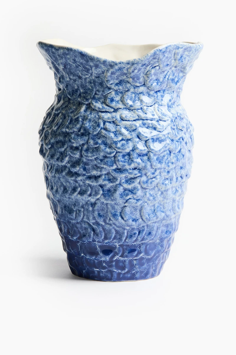 Grand vase en grès cérame à motif texturé. Modèle d'inspiration marine au design doucement arrondi avec col légèrement évasé et bord supérieur aux ondulations légèrement irrégulières. Article recouvert d'une glaçure réactive brillante produisant de belles variations de couleurs qui rendent chaque exemplaire unique.