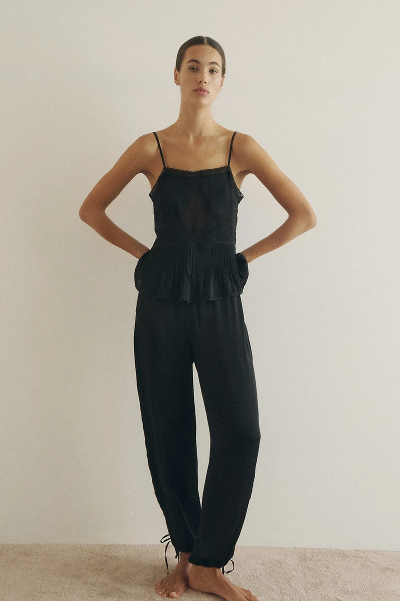Haut en satin de viscose. Modèle avec encolure droite bordée de dentelle et fines bretelles réglables. Incrustations de dentelle, panneau en dentelle transparente, broderies et plis nervure devant. Ouverture agrémentée de boutons habillés dans le dos.