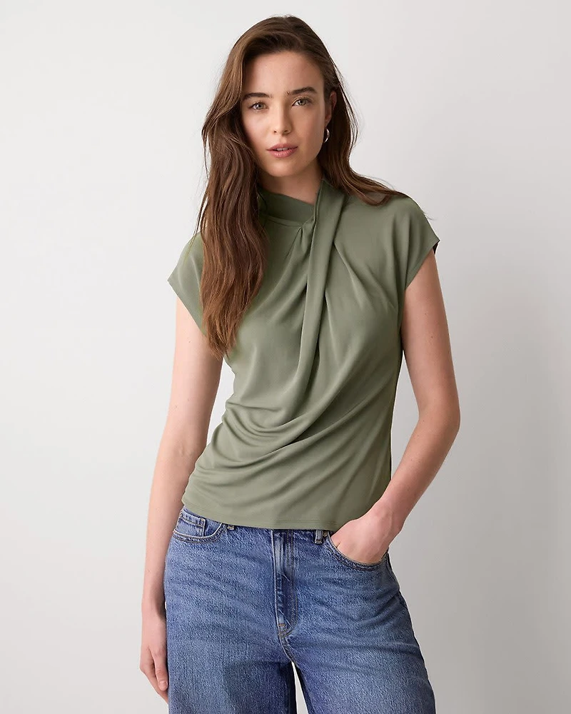 Simple, mais super élégant, ce haut à manches très courtes doté d'un unique col montant drapé à détail croisé est exactement ce qu'il vous faut pour rehausser votre style. Coupe - Coupe classique: Suit légèrement les courbes de votre silhouette avec un peu plus d'aisance - Manches très courtes - Longueur avant de 23,5'' (taille M) Caractéristiques - Tricot extensible - Col montant drapé avec détail croisé