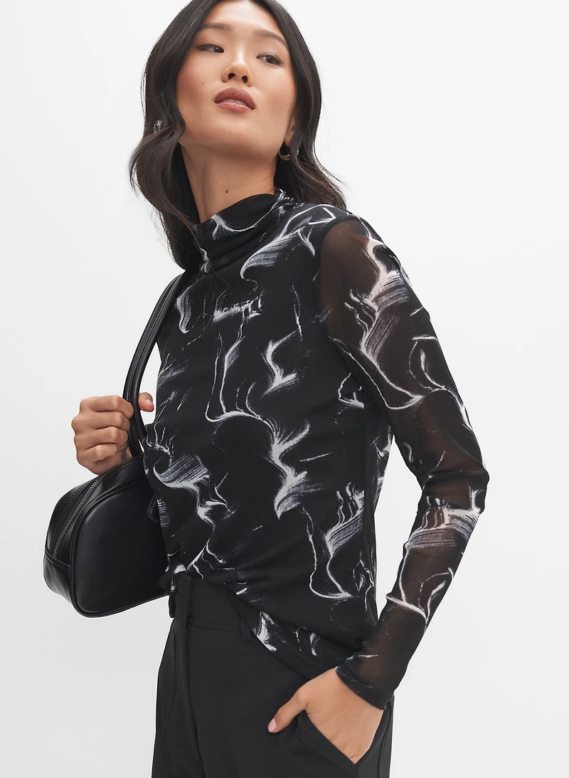 Enfilez notre haut ajusté transparent à manches longues à motif audacieux. Portez-le avec un pantalon à jambe large et un sac structuré. Motif marbré Col montant Manches semi-transparentes Matière transparente Longueur à partir de l'épaule : 25,5 po