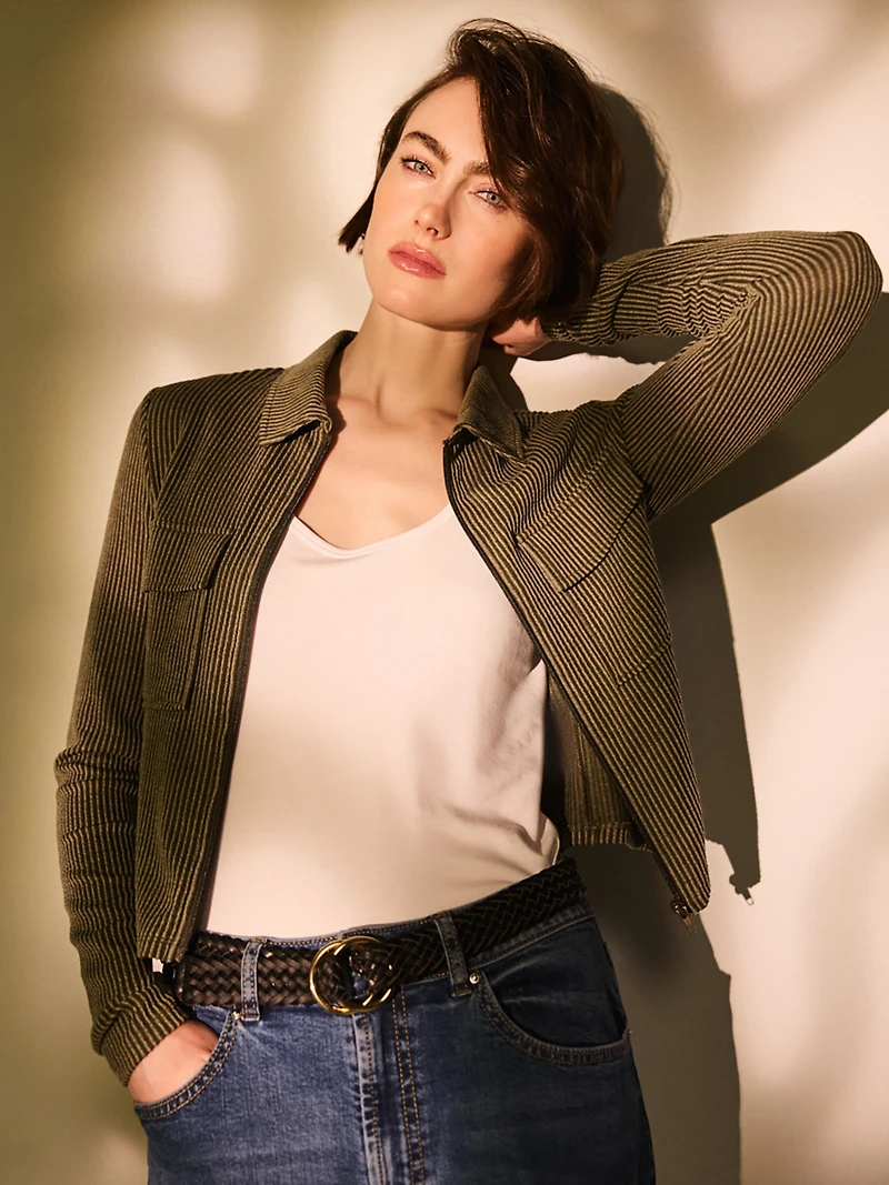 Version texturée d'un essentiel du quotidien, ce haut côtelé présente un col structuré, une fermeture éclair et des poches d'inspiration utilitaire à la poitrine. Sa coupe ajustée et sa maille structurée ajoutent une allure moderne et raffinée: facile à habiller, agréable à porter. Haut en maille Manches longues Tricot côtelé et texturé Fermeture éclair sur le devant Col Poches avant au niveau de la poitrine Sasha mesure 5 pi 8 po et porte la taille S Matière: 70% polyester, 23% rayonne, 7% spandex Lavage en machine à l'eau froide Suspendre pour sécher