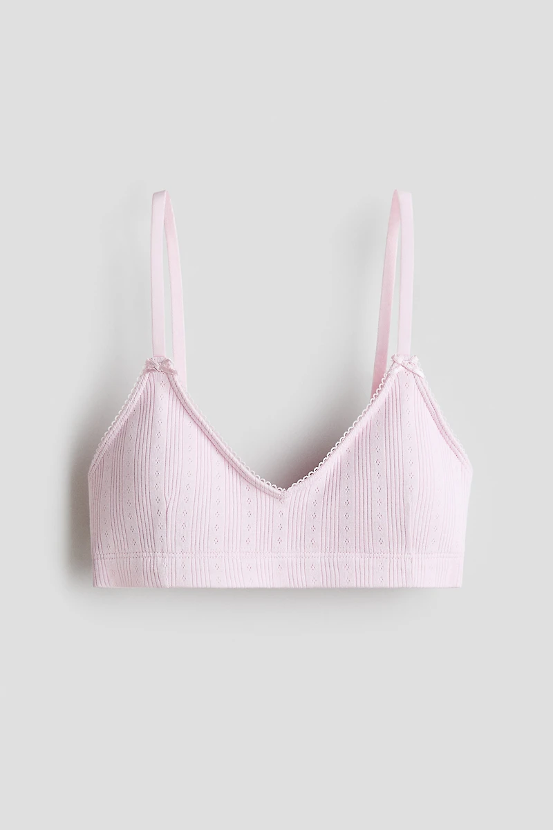 Haut court en jersey de doux jersey de coton pointelle. Modèle avec encolure en V à bord picots et coussinets amovibles. Fines bretelles réglables avec petite boucle décorative en satin devant. Fermeture par agrafes dans le dos. Doublé.