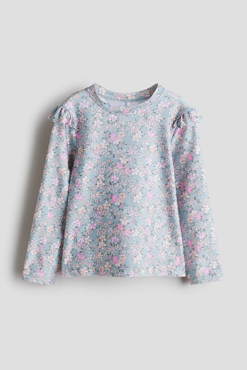 Haut de bain en textile UPF 50 protégeant des UV. Modèle avec petit col droit, bord à volant sur les épaules et manches longues.