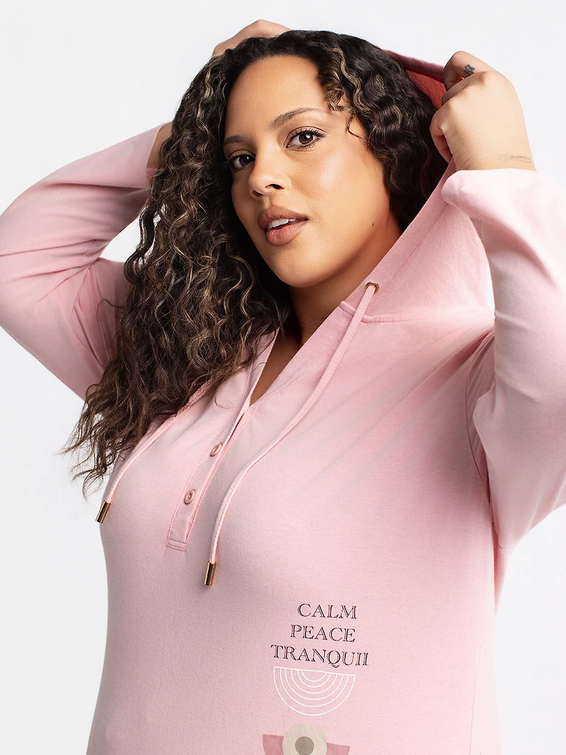 Haut à manches longues en textile extensible avec capuche et cordons de serrage. Encolure à trois boutons et impression graphique sur le côté inférieur droit.