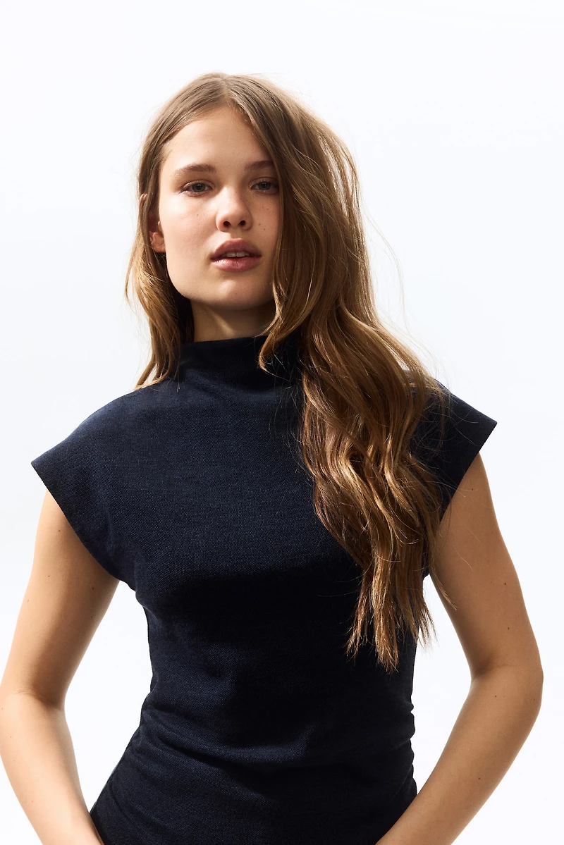 Haut en jersey. Modèle ajusté avec col cheminée et mancherons. Coutures latérales froncées pour un effet drapé.