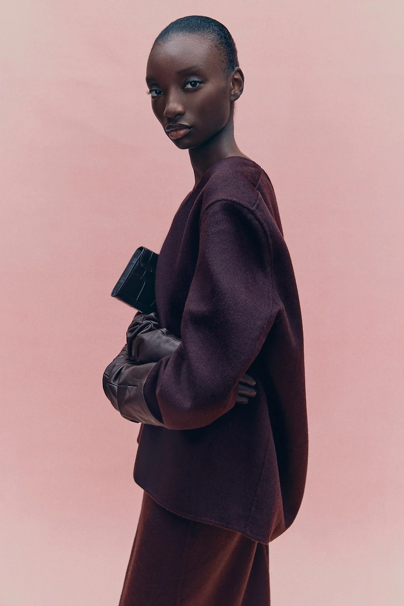 Haut fait main en feutre de laine mélangée. Modèle à encolure en V plongeante, emmanchures tombantes et manches longues.