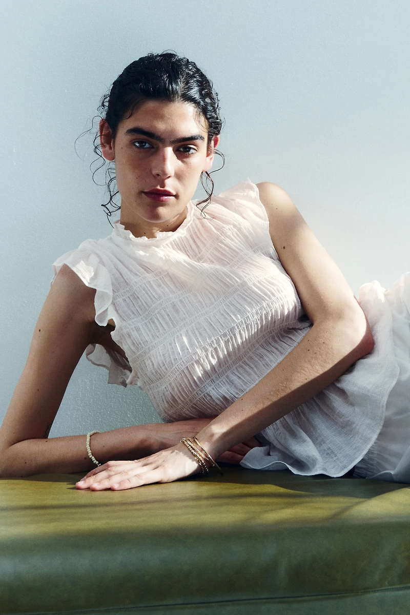 Haut en crêpe avec corsage smocké. Modèle à col à volants avec manches à volants et fente goutte d'eau surmontée d'un bouton dissimulé sur la nuque. Couture froncée à la taille et basque évasée.