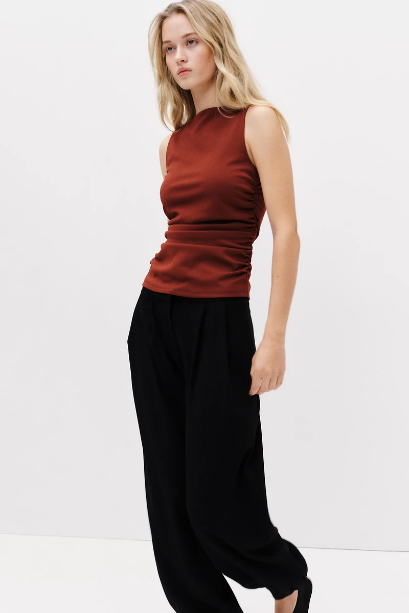 Haut sans manches en jersey extensible et texturé. Modèle à encolure bateau avec plis sur les côtés pour une effet légèrement drapé.