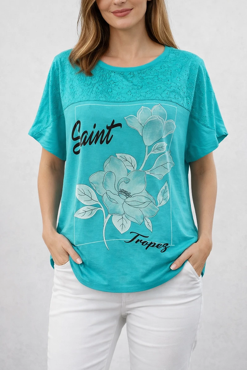 Haut floral tout aller, à œillets, encolure ronde et manches courtes, logo St-Tropez fini lustré. Marque : Hollywood Styles