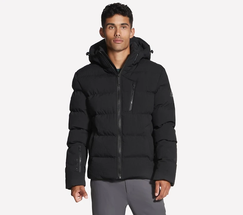Fight off frigid temperatures with Skechers Heat Embossed Puffer. Engineered for extreme cold weather, this textured mid-length jacket is insulated with eco-down fill, made from our water-repellent and wind-resistant fabric, and lined with soft faux fur for added warmth. It features a full-zip front, zippered hand, chest, and arm pockets, an adjustable hood, and storm cuffs.