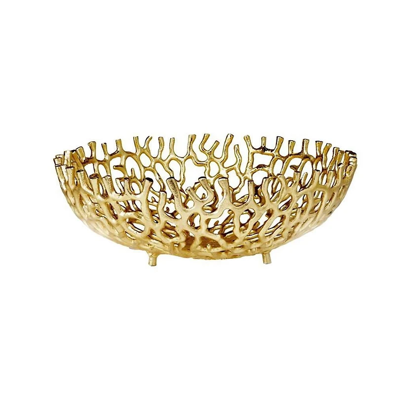 Élégant motif de branche de corail fait main en forme de bol rond en or. De belles branches de corail offrent une vue de tous vos accessoires décoratifs. Parfait pour ajouter un intérêt glamour et visuel à n'importe quel espace. Ou, faites-en la pièce maîtresse de n'importe quelle pièce. Plat décoratif de forme ronde en or métallique artisanal. Imite les motifs de coraux naturels. Découpe de corail en cours d'exécution découpé à la main. Aluminium massif coulé or avec une finition métallique.