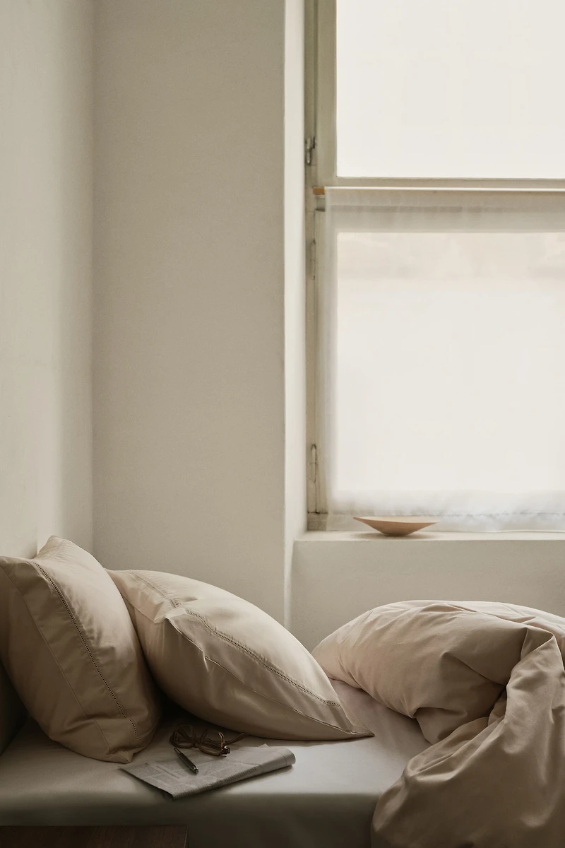 Housse de couette lit simple en satin de fil de coton d'Égypte fin au tissage serré avec finitions ton sur ton en dentelle ajourée en échelle. Densité 350 fils/po². Housse fermée par boutons dissimulés à la base. Une taie d'oreiller à rabat portefeuille.