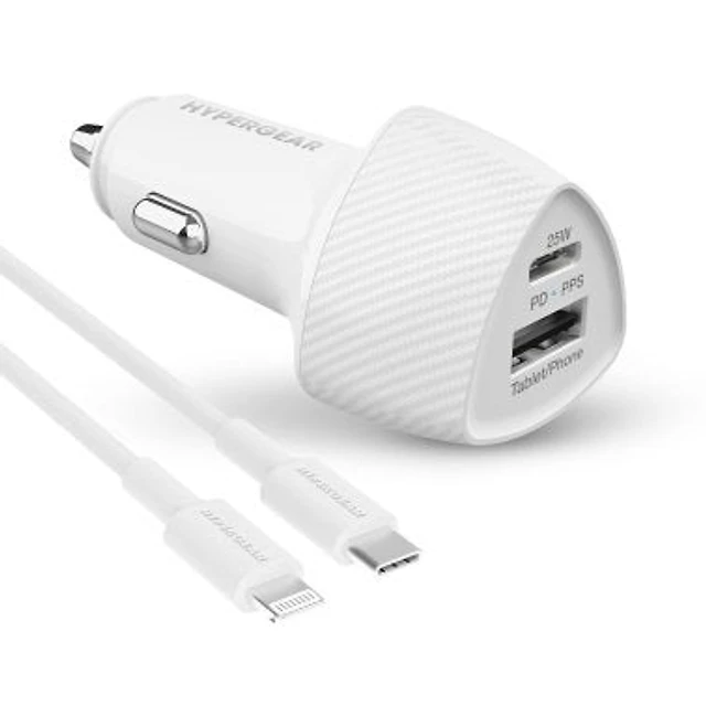 HyperGear SpeedBoost 25W USB-C PD + 12W USB Fast CLA Car Charger w/ PPS 4ft Lightning Cable - White