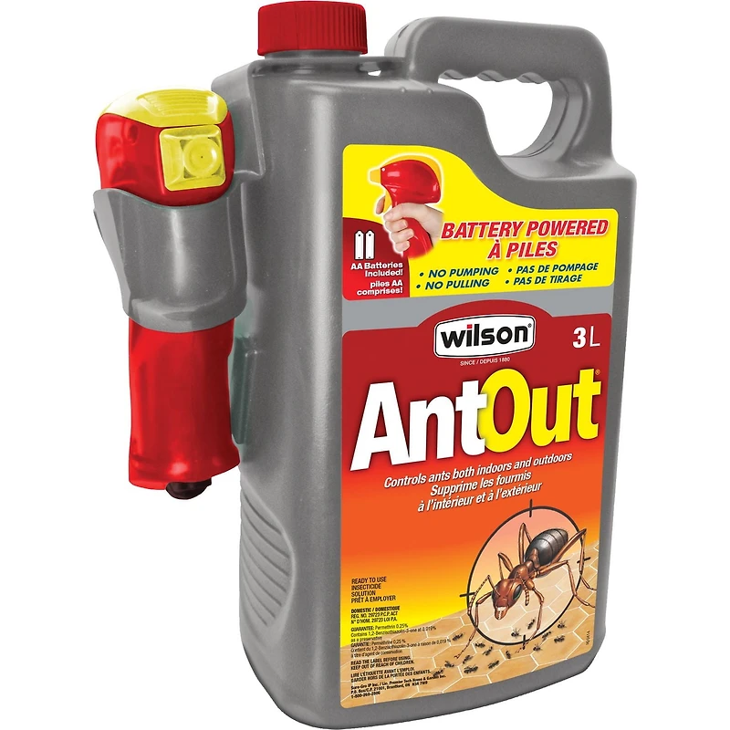 L'insecticide AntOut® à piles 3L de Wilson® est une solution prête à l'emploi permettant d'éliminer les fourmis efficacement et sans effort, à l'intérieur comme à l'extérieur. Son pulvérisateur à piles réduit la fatigue. Pas besoin de pomper ou de tirer : il suffit de viser et de pulvériser. Utiliser à l'intérieur pour éliminer les fourmis dans les fentes et les fissures, derrière les étagères et les tiroirs, le long des plinthes, sous et derrière les éviers, les cuisinières, les réfrigérateurs, les placards, etc. Pulvériser aussi sur les pistes, les nids et les points d’entrée. Utiliser à l'extérieur pour traiter les infestations localisées sur les patios, les terrasses et les zones non cultivées. Les fourmilières et les pistes devraient aussi être traitées. N'utiliser ce pulvérisateur qu'avec ce produit. Piles AA incluses.