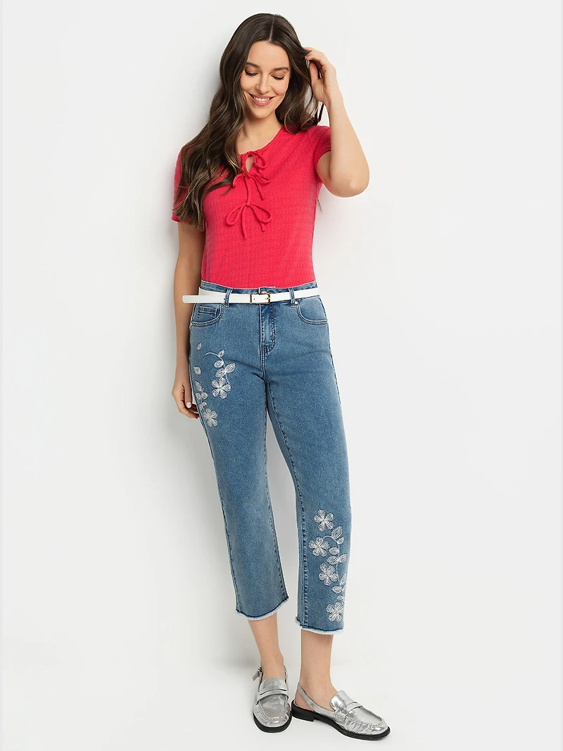 Jean court en denim tissé bleu présentant une coupe droite, cinq poches, des motifs floraux brodés placés sur les jambes et une longueur cheville avec bas de jambe à finition effilochée.