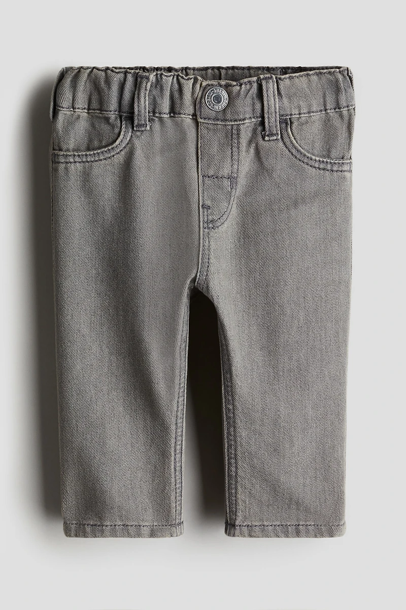 Jean en denim délavé. Modèle avec élastique réglable à la taille et fausse braguette surmontée d'un bouton-pression. Fausses poches devant et vraies poches dans le dos.