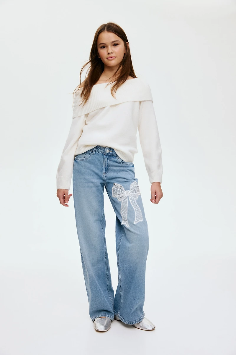 Jean 5 poches en denim de coton à l'aspect délavé avec une chaîne amovible. Coupe décontractée au niveau des hanches, des cuisses et des jambes. Modèle taille basse avec élastique réglable dans la ceinture et braguette à fermeture éclair surmontée d'un bouton.