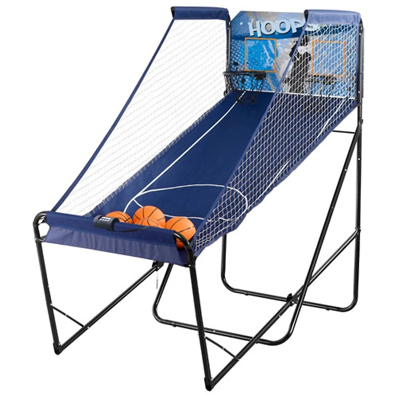 Système de pointage électronique à infrarouges au-dessus de chaque filet pour calculer vos points avec précision Compte à rebours électronique pour ajouter un peu de pression pendant que vous essayez de lancer les ballons dans le panier Cadre et filets robustes en acier avec revêtement pulvérisé et panneau arrière solide en bois pour une longue durée de vie Rampe en toile de nylon indéchirable avec filet latéral à couture double pour empêcher les ballons de rebondir hors du jeu Jeu repliable pour faciliter le rangement Pour utilisation à l'intérieur seulement Comprend six ballons de basketball de 7 po, une pompe avec aiguille pour le ballon, 2 filets de basketball et un adaptateur d'alimentation c.a./c.c. Dimensions ouvert : 41 (L) x 81 (H) x 81 (P) po Dimensions replié : 41 (L) x 81 (H) x 37 (P) po